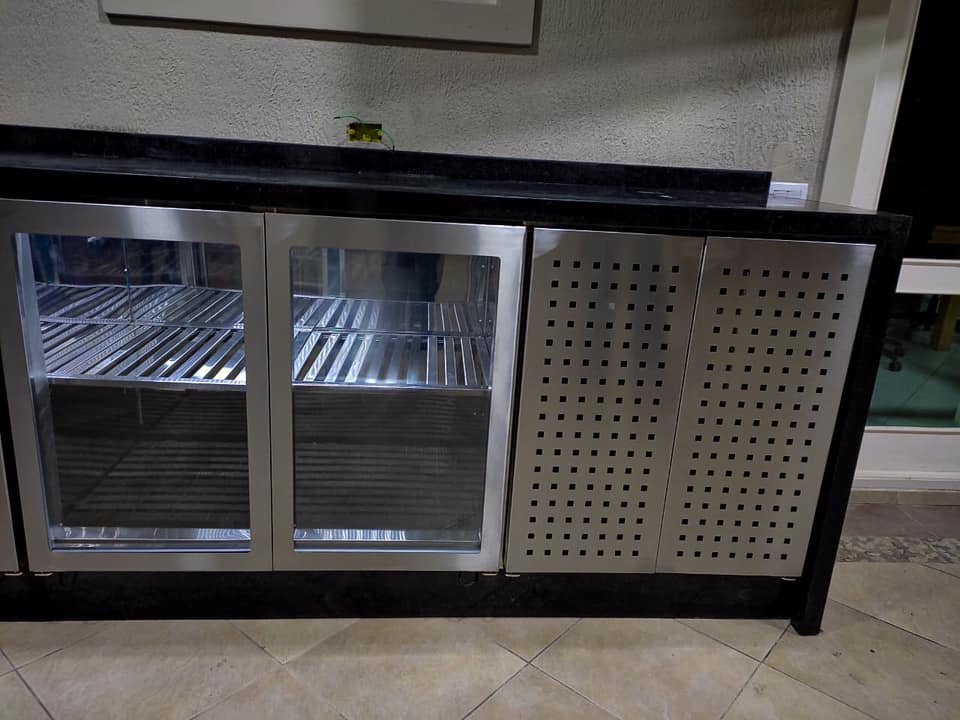 Balcão com vidro, sob medida. Refrigerado Balcão refrigerado, em inox, para área gourmet. Área gourmet, com balcão, churrasqueira pia e refrigeradores. Completa. Balcão refrigerado em inox, com iluminação interna. Fino acabamento. Toda em inox. Moderna.
